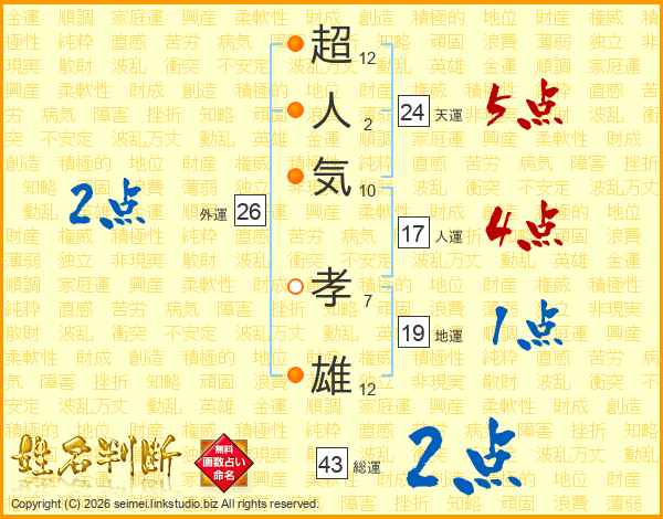 超(12画)人(2画)気(10画) 孝(7画)雄(12画)