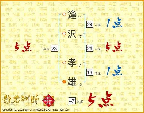 逢(11画)沢(17画) 孝(7画)雄(12画)