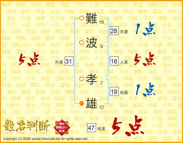 生活面を象徴する運勢です。外部から受ける影響力を表し、結婚運、家庭運や職場、環境への順応性を表します。総運から人運を引いた画数。姓や名が1文字の場合を除く。