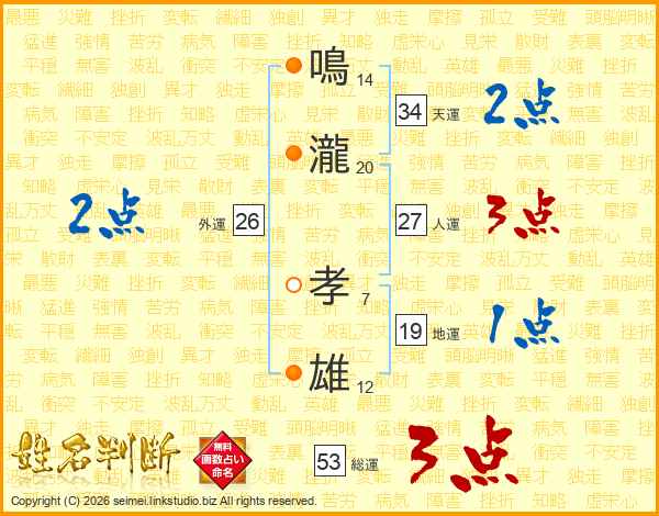 鳴(14画)瀧(20画) 孝(7画)雄(12画)