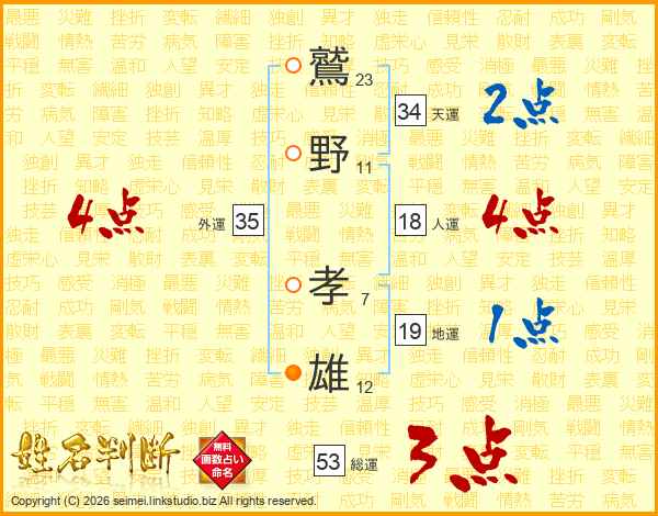 鷲(23画)野(11画) 孝(7画)雄(12画)