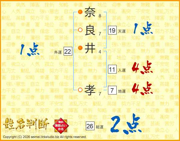 奈(8画)良(7画)井(4画) 孝(7画)