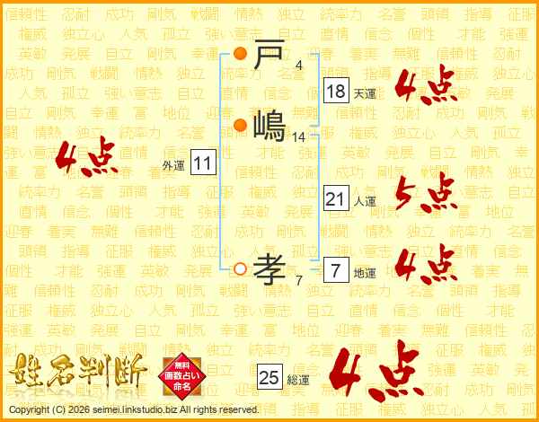 家系が持つ宿命的な運勢を表します。祖先から受け継いだ苗字ですので自分の力が及びません。家柄を象徴します。苗字の合計画数。