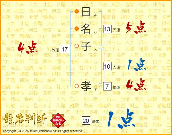 生活面を象徴する運勢です。外部から受ける影響力を表し、結婚運、家庭運や職場、環境への順応性を表します。総運から人運を引いた画数。姓や名が1文字の場合を除く。