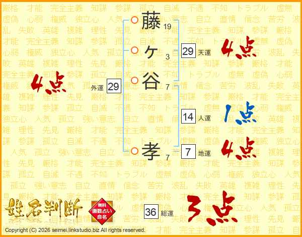 藤(19画)ヶ(3画)谷(7画) 孝(7画)