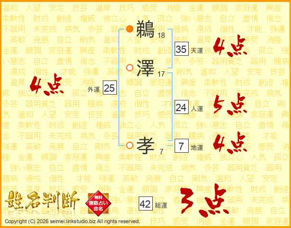 鵜(18画)澤(17画) 孝(7画)