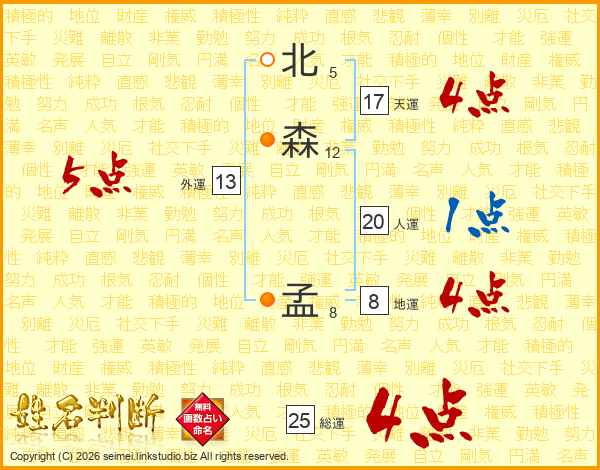 生活面を象徴する運勢です。外部から受ける影響力を表し、結婚運、家庭運や職場、環境への順応性を表します。総運から人運を引いた画数。姓や名が1文字の場合を除く。