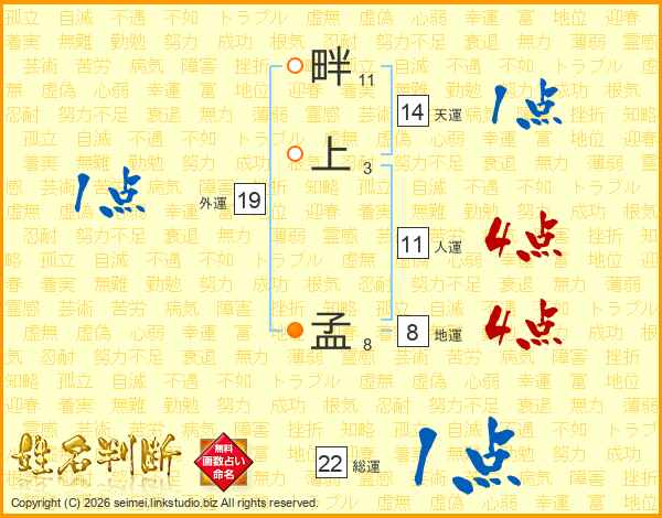 生活面を象徴する運勢です。外部から受ける影響力を表し、結婚運、家庭運や職場、環境への順応性を表します。総運から人運を引いた画数。姓や名が1文字の場合を除く。