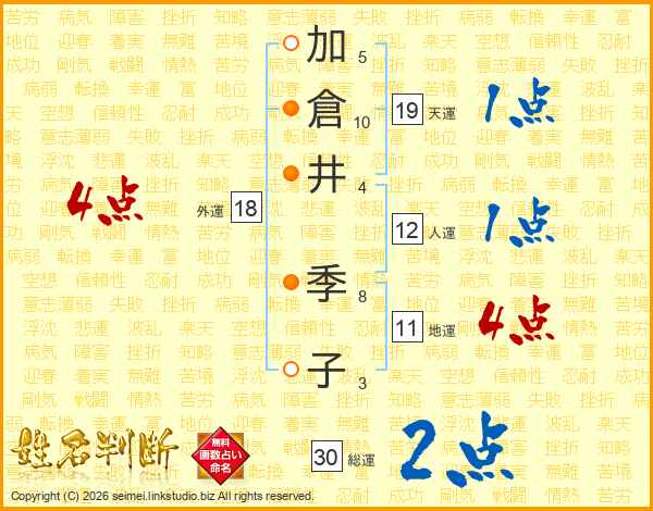 加(5画)倉(10画)井(4画) 季(8画)子(3画)