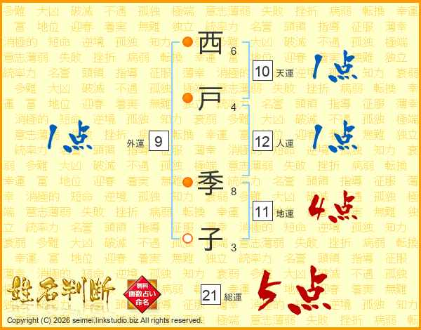 生活面を象徴する運勢です。外部から受ける影響力を表し、結婚運、家庭運や職場、環境への順応性を表します。総運から人運を引いた画数。姓や名が1文字の場合を除く。