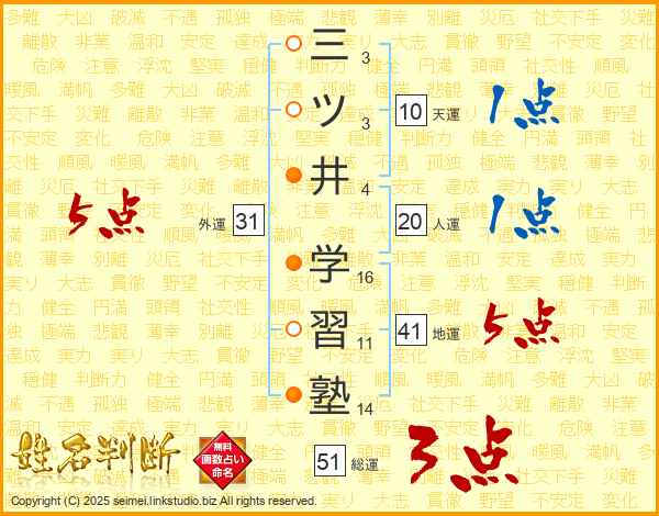 生活面を象徴する運勢です。外部から受ける影響力を表し、結婚運、家庭運や職場、環境への順応性を表します。総運から人運を引いた画数。姓や名が1文字の場合を除く。