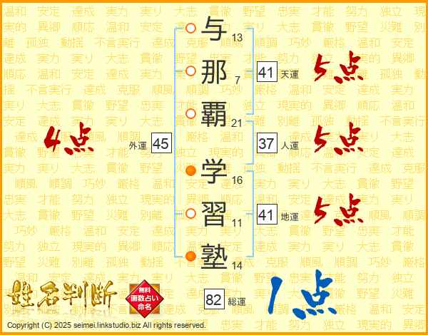 与(13画)那(7画)覇(21画) 学(16画)習(11画)塾(14画)