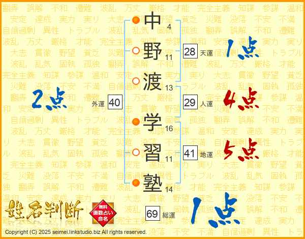 中(4画)野(11画)渡(13画) 学(16画)習(11画)塾(14画)