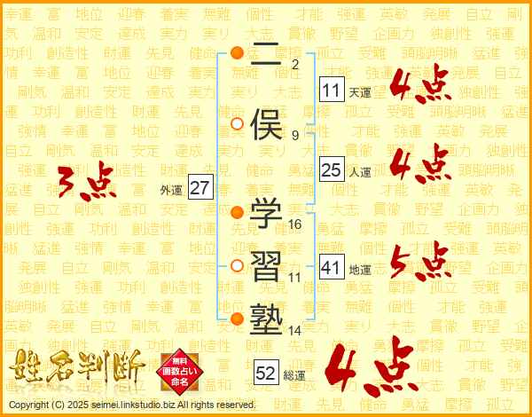 生活面を象徴する運勢です。外部から受ける影響力を表し、結婚運、家庭運や職場、環境への順応性を表します。総運から人運を引いた画数。姓や名が1文字の場合を除く。