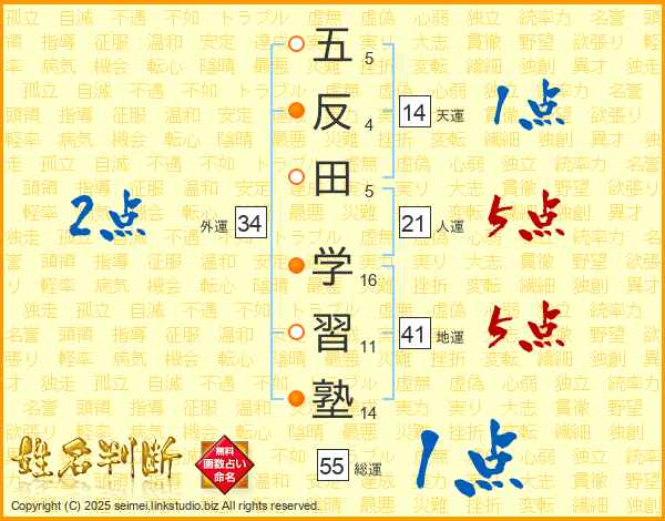 生活面を象徴する運勢です。外部から受ける影響力を表し、結婚運、家庭運や職場、環境への順応性を表します。総運から人運を引いた画数。姓や名が1文字の場合を除く。