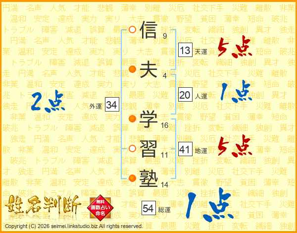 信(9画)夫(4画) 学(16画)習(11画)塾(14画)