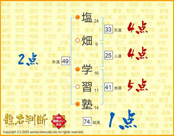 塩(24画)畑(9画) 学(16画)習(11画)塾(14画)