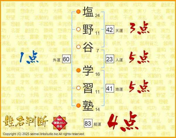 塩(24画)野(11画)谷(7画) 学(16画)習(11画)塾(14画)