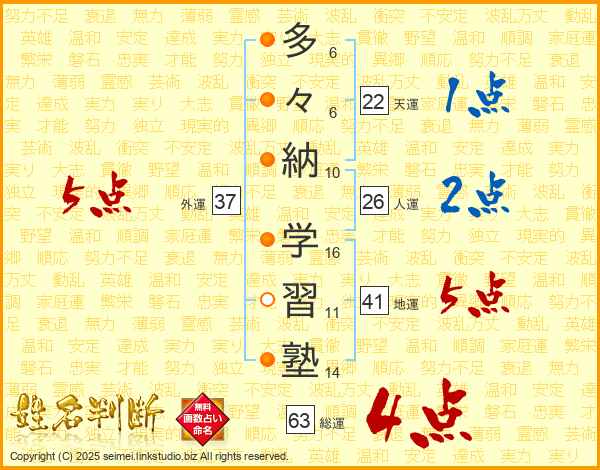 多(6画)々(6画)納(10画) 学(16画)習(11画)塾(14画)