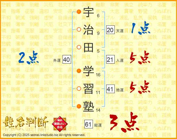 宇(6画)治(9画)田(5画) 学(16画)習(11画)塾(14画)