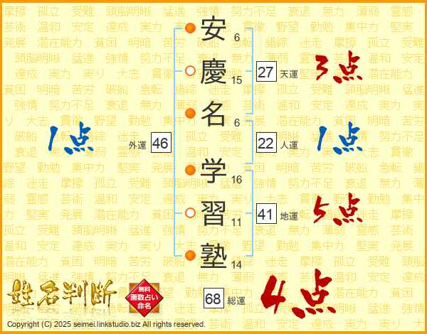 安(6画)慶(15画)名(6画) 学(16画)習(11画)塾(14画)