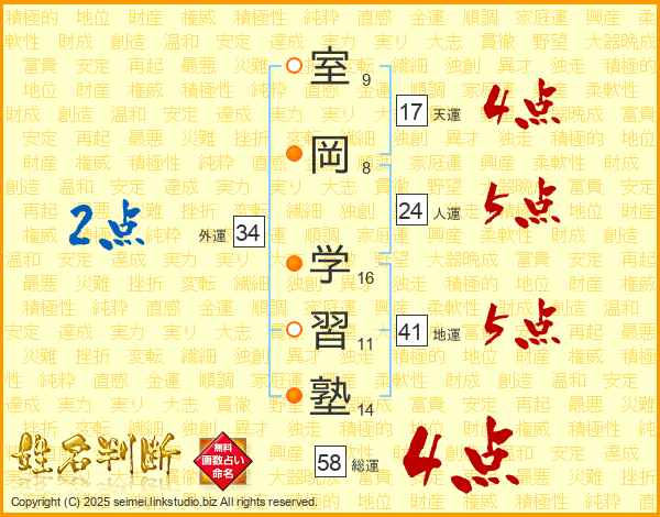 室(9画)岡(8画) 学(16画)習(11画)塾(14画)