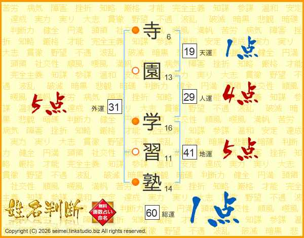 寺(6画)園(13画) 学(16画)習(11画)塾(14画)