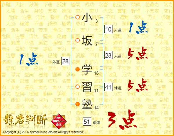 小(3画)坂(7画) 学(16画)習(11画)塾(14画)