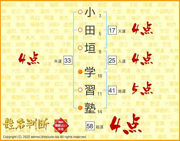 小(3画)田(5画)垣(9画) 学(16画)習(11画)塾(14画)