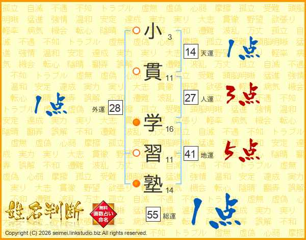 小(3画)貫(11画) 学(16画)習(11画)塾(14画)