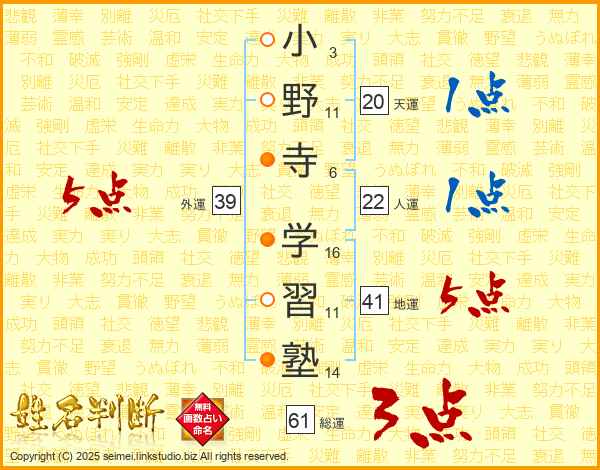 小(3画)野(11画)寺(6画) 学(16画)習(11画)塾(14画)