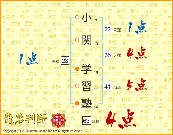 小(3画)関(19画) 学(16画)習(11画)塾(14画)