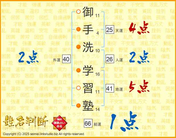 御(11画)手(4画)洗(10画) 学(16画)習(11画)塾(14画)