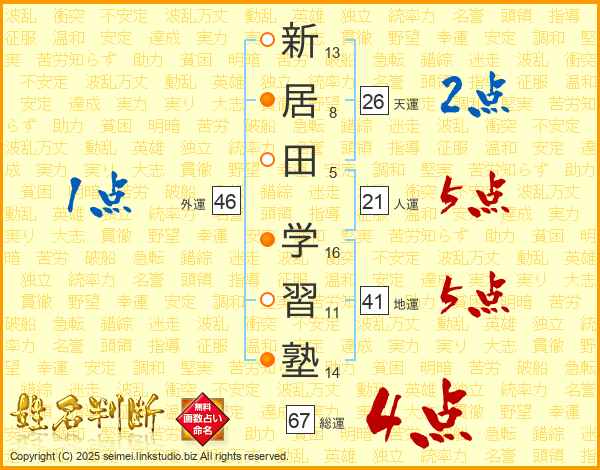 新(13画)居(8画)田(5画) 学(16画)習(11画)塾(14画)
