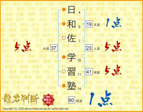 日(4画)和(8画)佐(7画) 学(16画)習(11画)塾(14画)