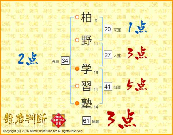 柏(9画)野(11画) 学(16画)習(11画)塾(14画)