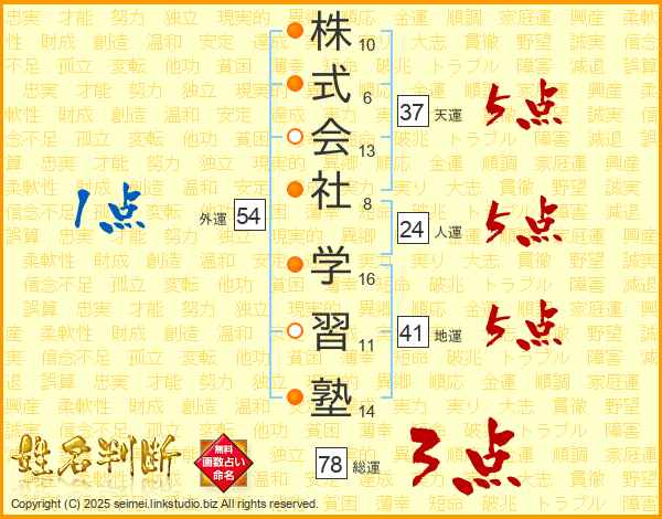 株(10画)式(6画)会(13画)社(8画) 学(16画)習(11画)塾(14画)