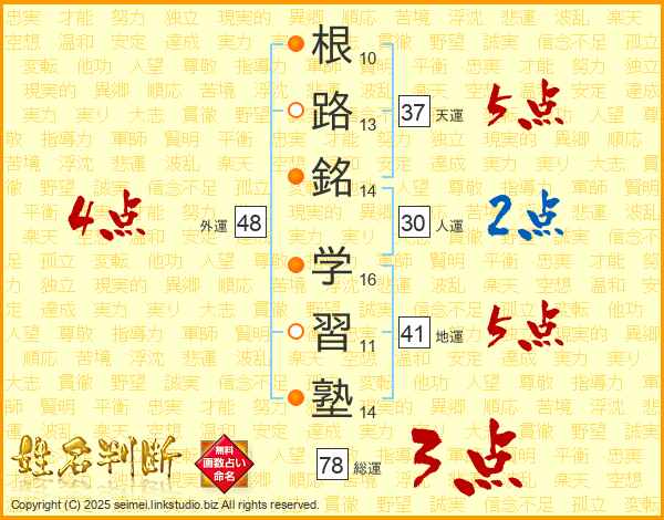 根(10画)路(13画)銘(14画) 学(16画)習(11画)塾(14画)