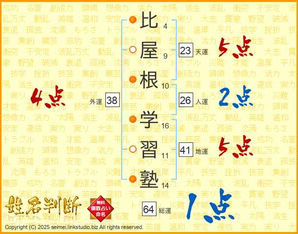 比(4画)屋(9画)根(10画) 学(16画)習(11画)塾(14画)