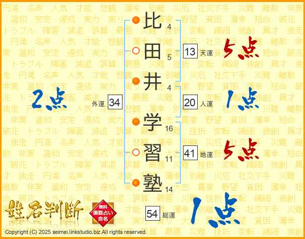 比(4画)田(5画)井(4画) 学(16画)習(11画)塾(14画)