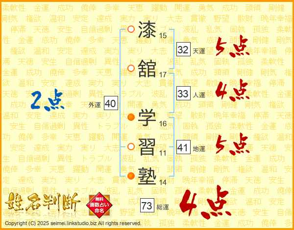漆(15画)舘(17画) 学(16画)習(11画)塾(14画)