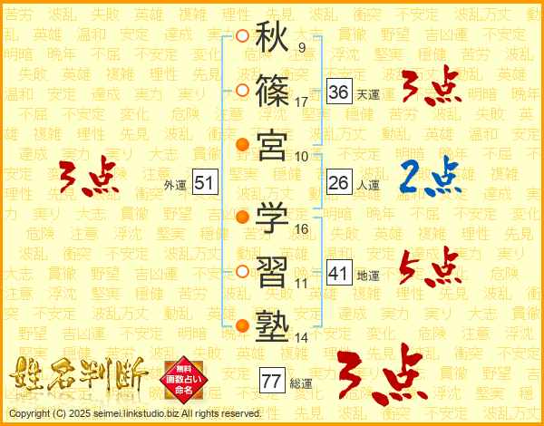 秋(9画)篠(17画)宮(10画) 学(16画)習(11画)塾(14画)
