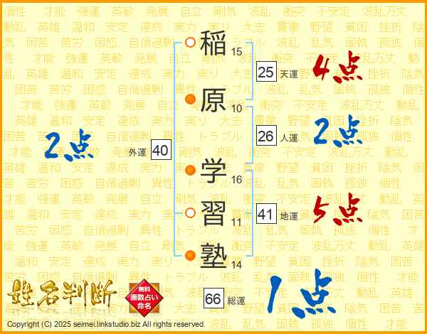 稲(15画)原(10画) 学(16画)習(11画)塾(14画)