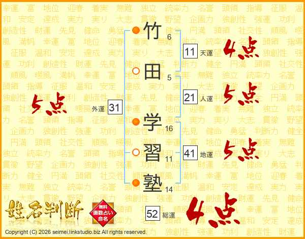 竹田学習塾さんの総運は52画の4点!