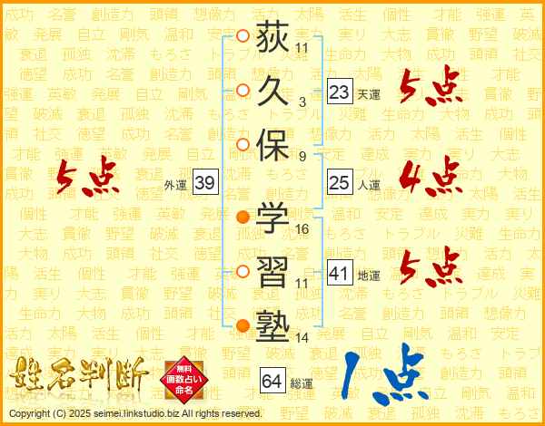 荻(11画)久(3画)保(9画) 学(16画)習(11画)塾(14画)
