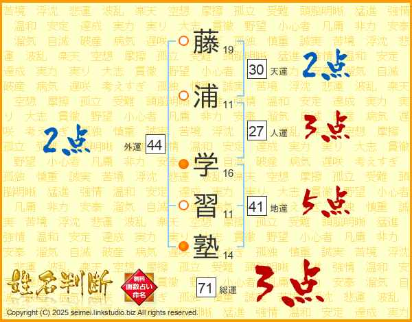 藤(19画)浦(11画) 学(16画)習(11画)塾(14画)