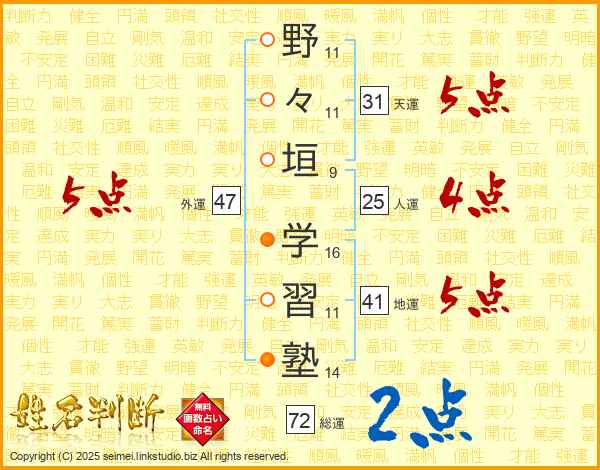 野(11画)々(11画)垣(9画) 学(16画)習(11画)塾(14画)