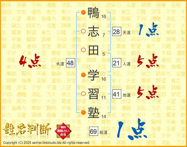 鴨(16画)志(7画)田(5画) 学(16画)習(11画)塾(14画)