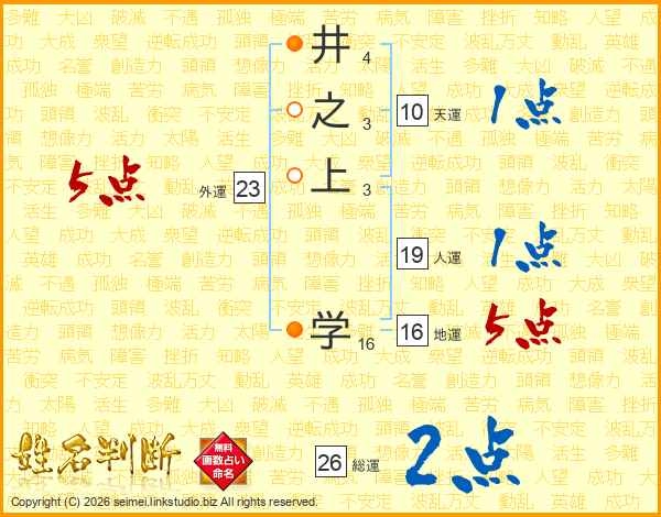 生活面を象徴する運勢です。外部から受ける影響力を表し、結婚運、家庭運や職場、環境への順応性を表します。総運から人運を引いた画数。姓や名が1文字の場合を除く。