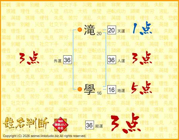 生活面を象徴する運勢です。外部から受ける影響力を表し、結婚運、家庭運や職場、環境への順応性を表します。総運から人運を引いた画数。姓や名が1文字の場合を除く。